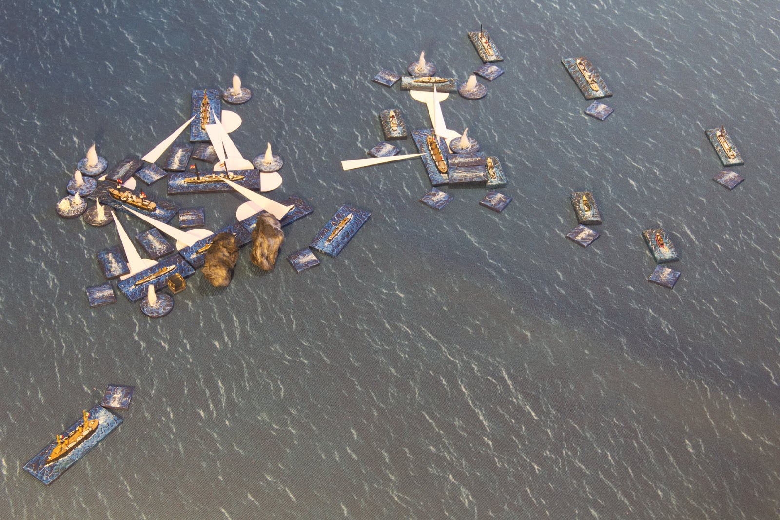 On the right inshore flank, (far back in the photo above), is a small armed merchant which I stuck in there simply because I wanted to find a use for the Tumbling Dice 'Armed Yacht' model. I couldn't find anything in Conway's that seemed appropriate, so I just invented a ship. I gave her an ADV of 4, two 4.1" turrets (probably a little generous but whatevs), one quickfirer factor each side, and a speed of 12 knots. I christened her Korčula. May God save her and all who sink in her. She is destined for great things.