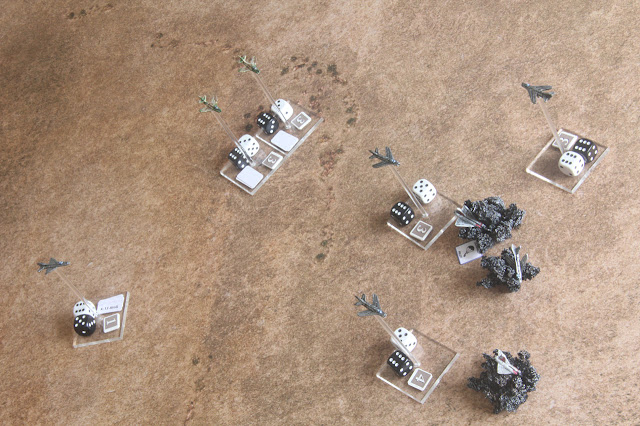 In MT all planes are written onto a 'flight plan' where you mark the entry turn and altitude of all your aircraft. This is done in secret, so for the purposes of this solo game I decided to roll 1D3 for the turn and 1D6 for the altitude for each element. (If the altitude rolled was higher than the plane's ceiling then it entered at its maximum altitude.)